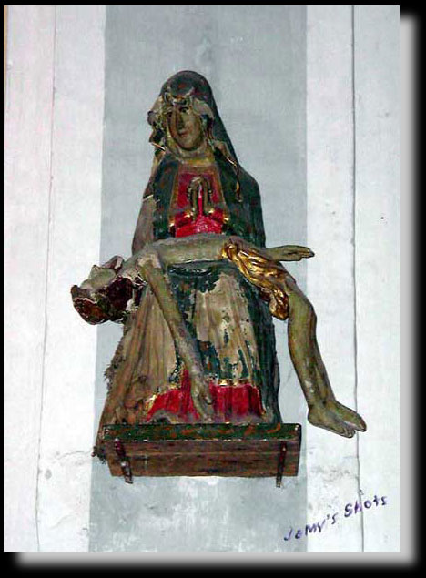 Les images de Marie sont pourtant rares dans nos chapelles hors des récits de l'enfance du Christ et les dernières scènes de la Passion. Giovani Baleison lui confère, dans la modestie, la majesté discrète de la "Reine des cieux". Si différent de sa tenue rituelle, le manteau qui lui couvre la tête mais dégage sur son front ses cheveux blonds, est tout entier doublé d'hermine, et ses beaux enroulements ajoutent au raffinement de l'image; le trône richement ouvragé est surmonté d'un dais, toujours signe de gloire, revêtu ici de matière précieuse, or ou jade, aux nervures parées de perles, et dont l'irréelle dentelle de marbre, pour les habitants des pauvres maisons du temps devait évoquer la beauté de la Cité éternelle. Le temps des souffrances est passé; l'Enfant ne tient plus, serré dans sa main le chardonneret rituel, signe de la Passion, mais une colombe, biblique promesse de paix.