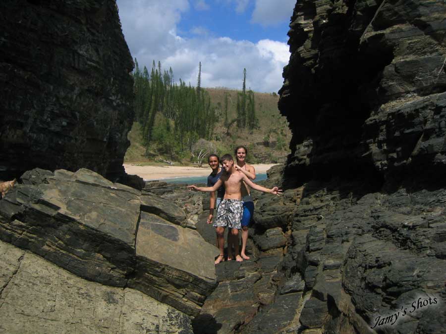 Fanny, Margot et Florian dans les vagues de la roche percée à Bourail.