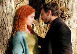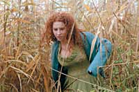 The contrast between Claire's thick, bouncing curls of flaming red and her alabaster skin is what defines the ambience of "Brodeuses." Because Claire's coloring has such visual impact, it's enough to just to keep looking at her, bent over her needle. Watching the two seamstresses work, the viewer might get an idea of what painters like Vermeer (who also had a penchant for capturing women doing handwork on his canvases) must have felt as he sketched his models working in their chairs -- how the light from the window created halos on their heads and highlighted their nimble fingers.
