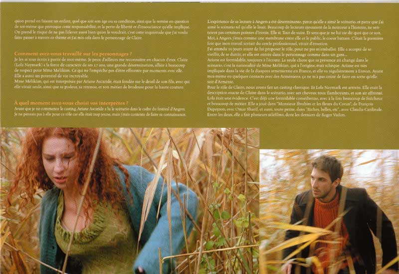 Sa fraîcheur et sa distance se reflètent dans les personnalités à la fois de Mme Mélikian et de Claire et elle les décrit comme étant « un amalgame d’elle-même ». Elle a demandé à la rayonnante Ascaride d’atténuer sa personnalité habituelle à l’écran pour jouer une femme qui était « comme la lune, sombre et mystérieusement lumineuse ». Et puis elle a cherché une jeune actrice avec la retenue et la maturité de Claire et elle a choisi Lola Naymark. « C’était aussi sa chevelure » dit Éléonore Faucher. « A l’écran, elle possède une qualité comme nul autre pareil ».