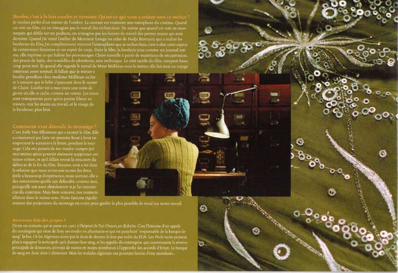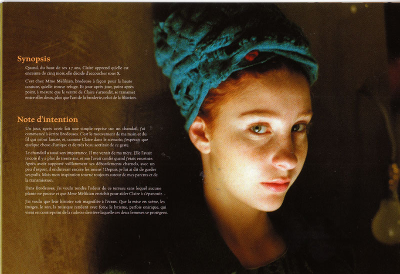 Synopsis : When Claire learns that she is five months pregnant at the tender age of 17, she decides to give birth anonymously. She finds refuge with Madame Melikian, an embroiderer for haute couture designers. And, day by day, stitch by stitch, as Claire's belly grows rounder, the threads of embroidery create a filial bond between them. 2003/88min (release dates: 13 October 2004) Directed by: Eléonore Faucher With: Lola Naymark, Ariane Ascaride Distributor (Japan) : Cinequanon