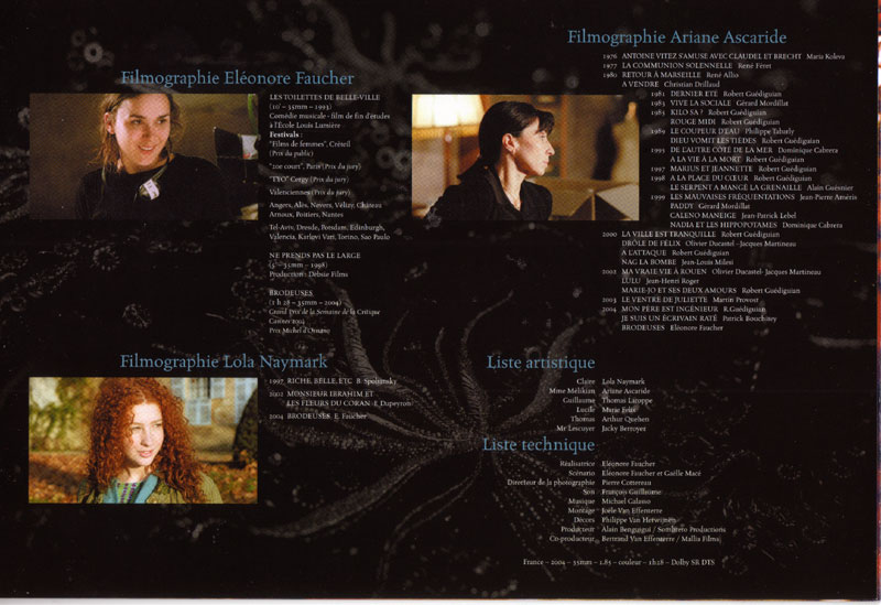 A propos Cannes 2004 : Semaine Internationale de la Critique. Gaëlle Macé, qui co-écrit le scénario de BRODEUSES, a notamment collaboré avec Jackie Berroyer et Patrick Bouchitey sur le script de VICE & VERSA, la deuxième réalisation de Bouchitey après LUNE FROIDE. Lola Naymark a joué dans MONSIEUR IBRAHIM ET LES FLEURS DU CORAN de François Dupeyron. Elle y interprétait la voisine de Momo.
